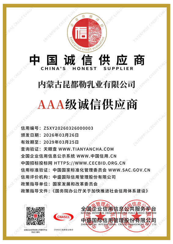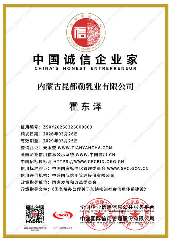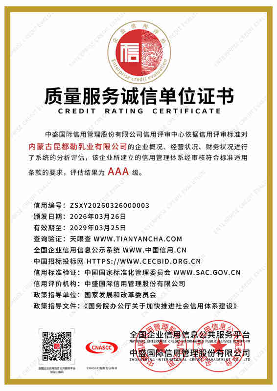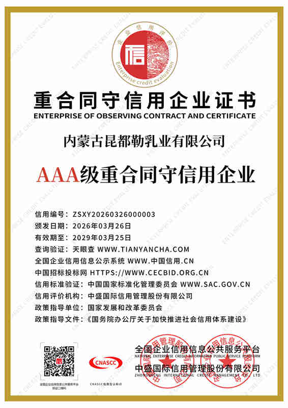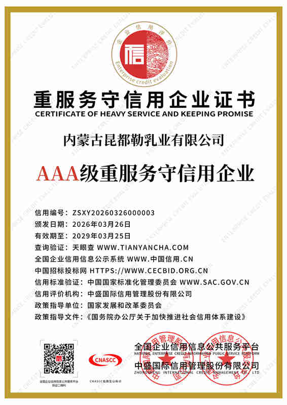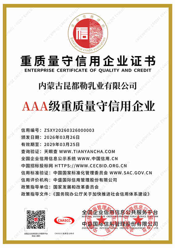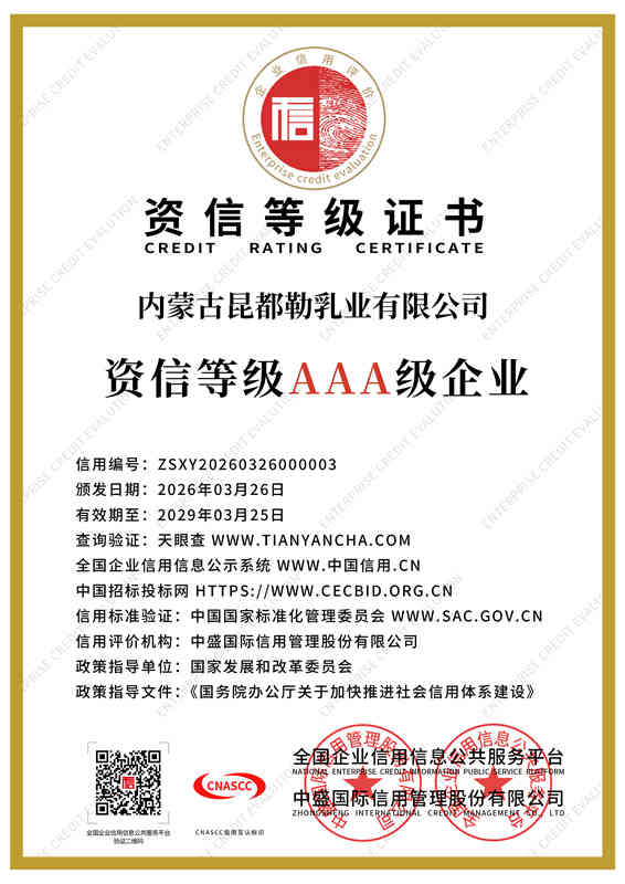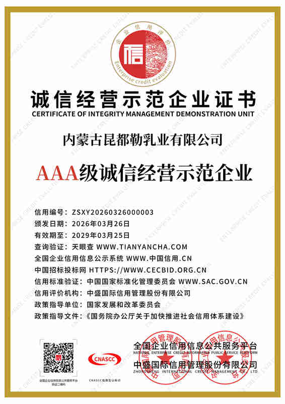 内蒙古昆都勒乳业有限公司成立于2024年,坐落于内蒙古赤峰市红山区,是一家专注牛奶制品研发、生产与销售的现代化食品企业 。公司依托内蒙古优质奶源带优势,精选原生牧场奶源,采用先进工艺与严格品控,打造高品质乳制品。核心产品涵盖纯牛奶、酸奶、奶酪、A2β-酪蛋白牛奶、活性硒牛奶及乳饮料等全品类牛奶制品。公司坚守“品质为先、营养至上”理念,聚焦健康乳品,为消费者提供安全、新鲜、高营养的奶制品,致力成为值得信赖的区域乳业品牌。