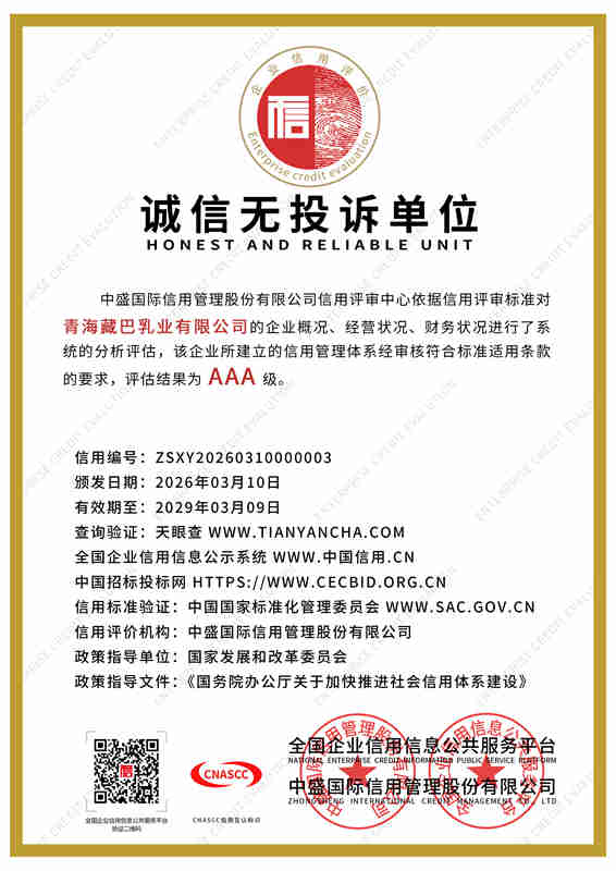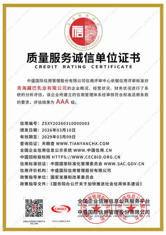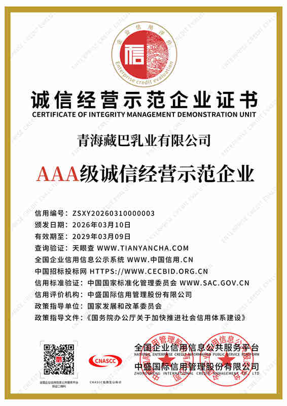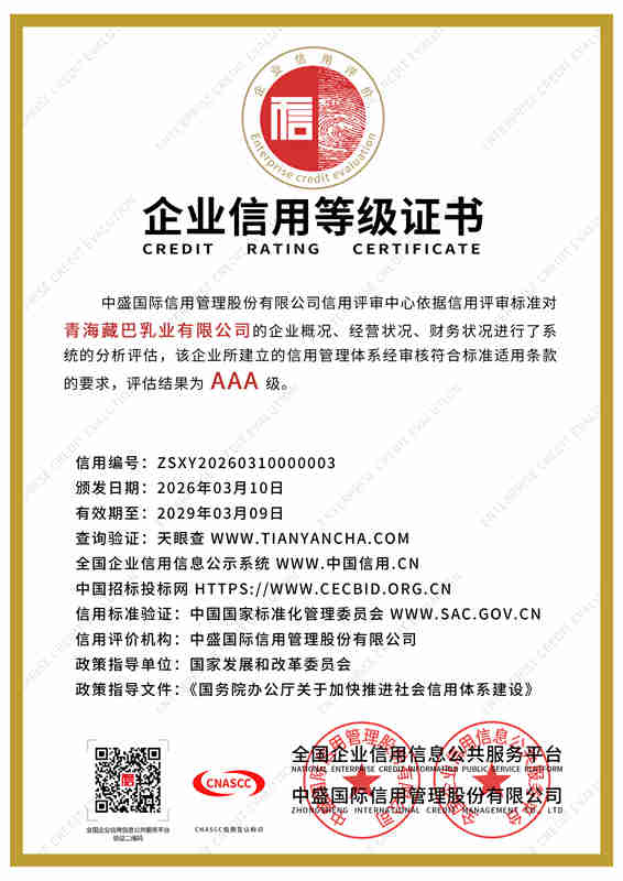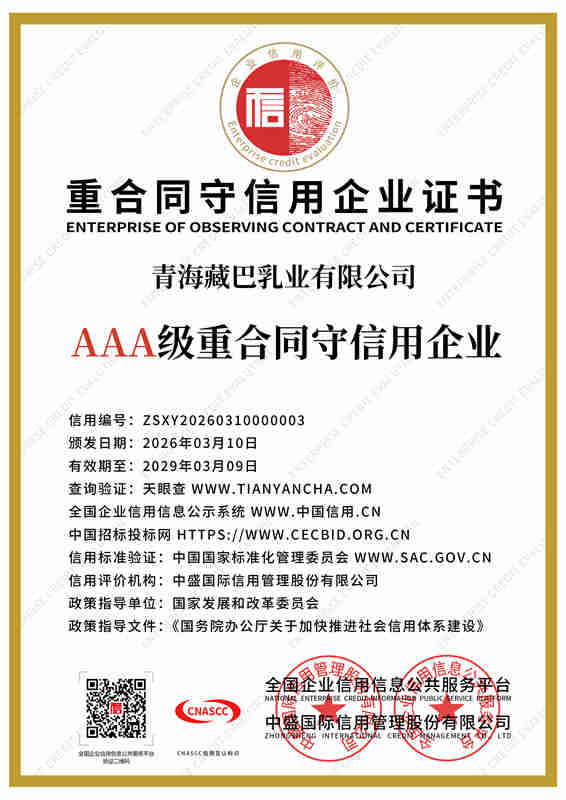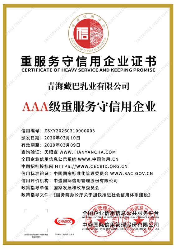 青海藏巴乳业立足“牦牛之都”青海,锚定强国品牌使命,深耕珍稀牦牛乳产业,以产业兴农赋能青藏乳业高质量发展。依托全产业链布局与“公司+牧户+基地”合作模式,甄选高海拔雪域高原原生态奶源。配备数万级净化车间与现代化智能生产线,全程冷链锁鲜,当日原奶精深加工,严格把控高端品质。主营纯牦牛奶、高钙初乳等高端乳制品,富含免疫球蛋白、原生乳钙及天然营养,纯净天然、易吸收。企业坚守产业报国初心,以匠心铸精品,致力打造青藏地区标杆性民族乳企,铸就国民信赖的高原匠心品牌。